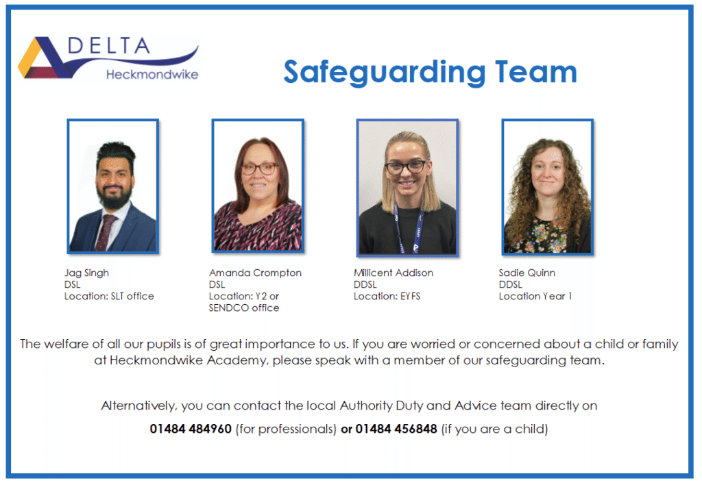 If you have a concern about the welfare or safety of a child, then you can speak to any staff member who you feel comfortable with and they will act accordingly. Our Senior Leadership Team for Safeguarding will ensure that all concerns are acted upon appropriately. The school will, in most circumstances, endeavour to discuss all concerns with parents about their children if a concern has been raised. However, there may be exceptional circumstances when the school will discuss concerns with Duty and Assessment and/or the Police without parental knowledge (in accordance with Kirklees Safeguarding Children Procedures).